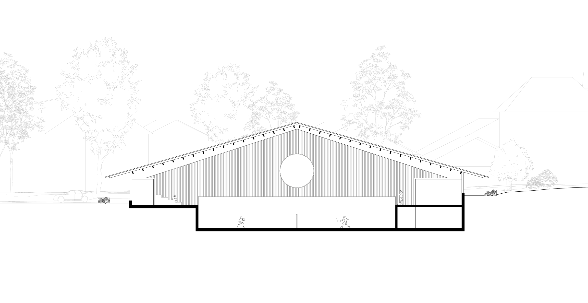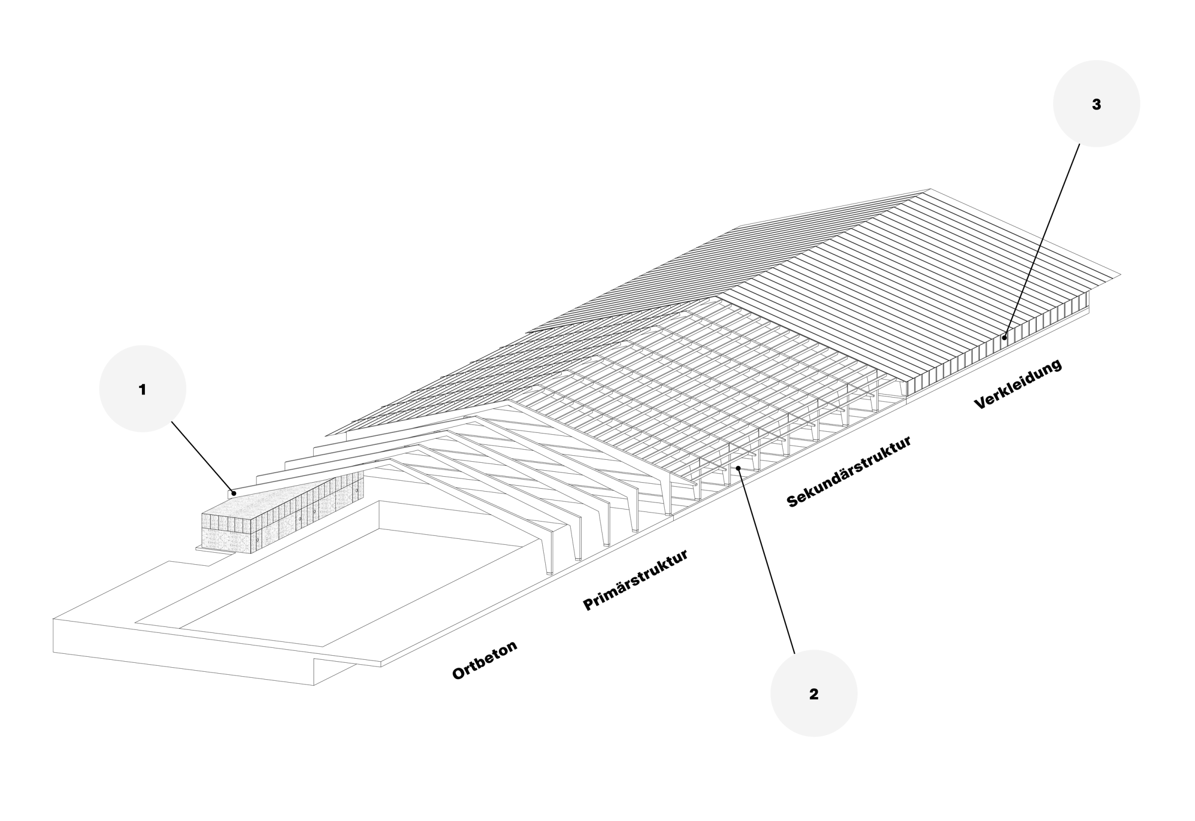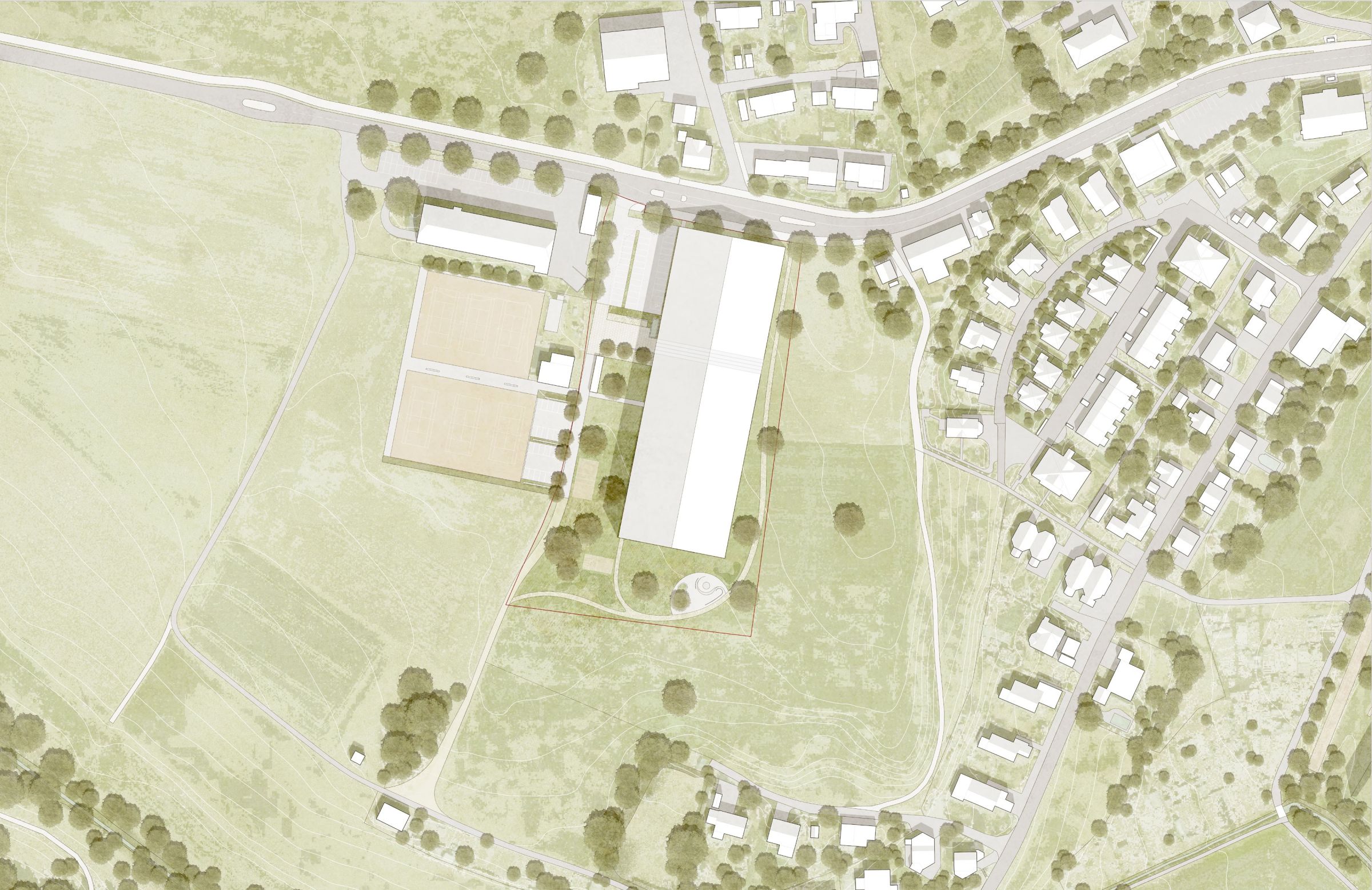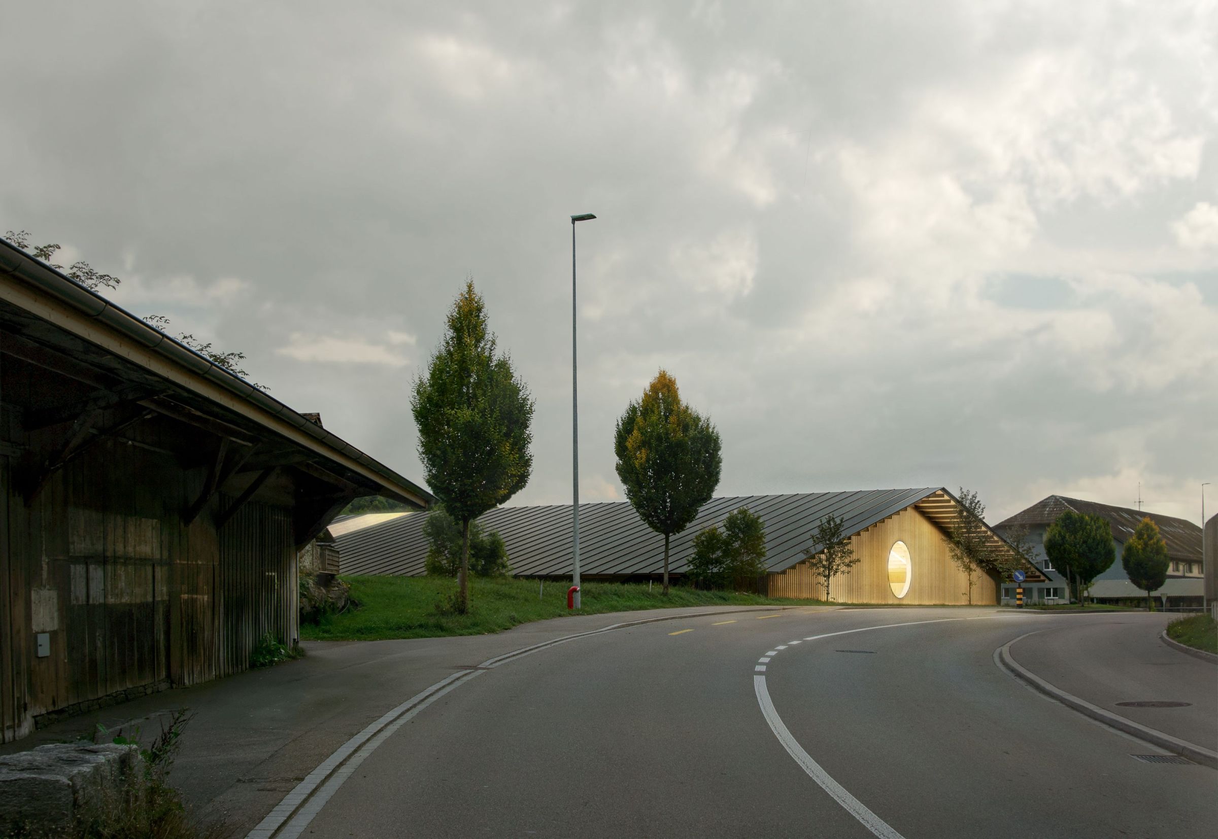 Die neue Sporthalle Sonnenhof in Oberuzwil fügt sich harmonisch in den Dorfrand ein und nimmt mit ihrem Satteldach Bezug auf die ländlichen Bautypologien der Umgebung. Unter einem Dach vereint sie zwei lokale Vereine und schafft einen identitätsstiftenden Leuchtturm, der Synergien fördert und der Gemeinde Mehrwert bietet. Als offener, flexibler Raum ermöglicht die Halle vielfältige Nutzungen für Sport, Kultur und Begegnung. Klare Strukturen, einfache Tragkonstruktionen und gezielt eingesetzte Fenster- und Fassadenelemente prägen den architektonischen Ausdruck. Das Freiraumkonzept integriert das Projekt selbstverständlich in den Bestand und die Landschaft, und schafft ein Ort der Begegnung. Nachhaltige Materialien, optimierte Flächeneffizienz und minimale Haustechnik sichern langfristige Wirtschaftlichkeit und eine hohe Nutzungsflexibiltät in der Zukunft.